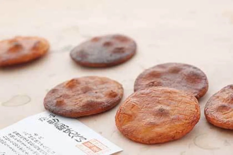 福屋の名物『勘三郎せんべい』は、歌舞伎俳優の十七代目中村勘三郎丈が「もっと焼け、もっと焦がすんだ」と、自分好みの焦げ加減に特注したもの。
