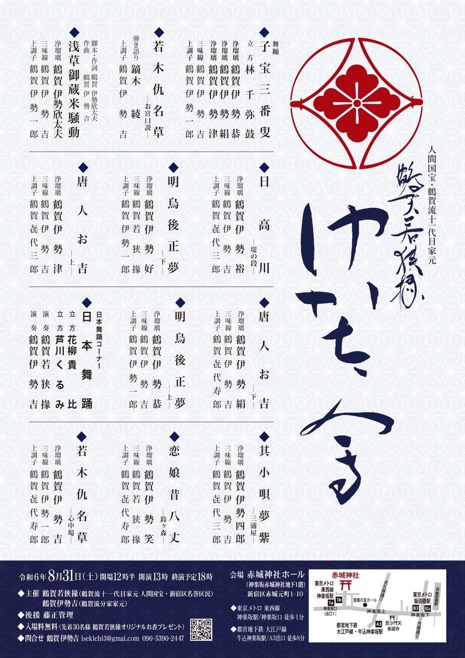 主催:鶴賀若狭掾(鶴賀流十一代目家元 人間国宝・新宿区名誉区民)、鶴賀伊勢吉(鶴賀流分家家元)