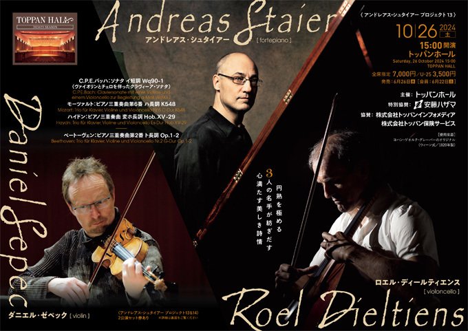 10/26(土)開催の「アンドレアス・シュタイアー プロジェクト 13」に出演を予定しておりましたロエル・ディールティエンス(チェロ)は、10/10(木)に転倒により手にケガを負い、1か月程度の加療が必要と診断されたため、大変残念ながら今回の来日は取り止めとなりました。