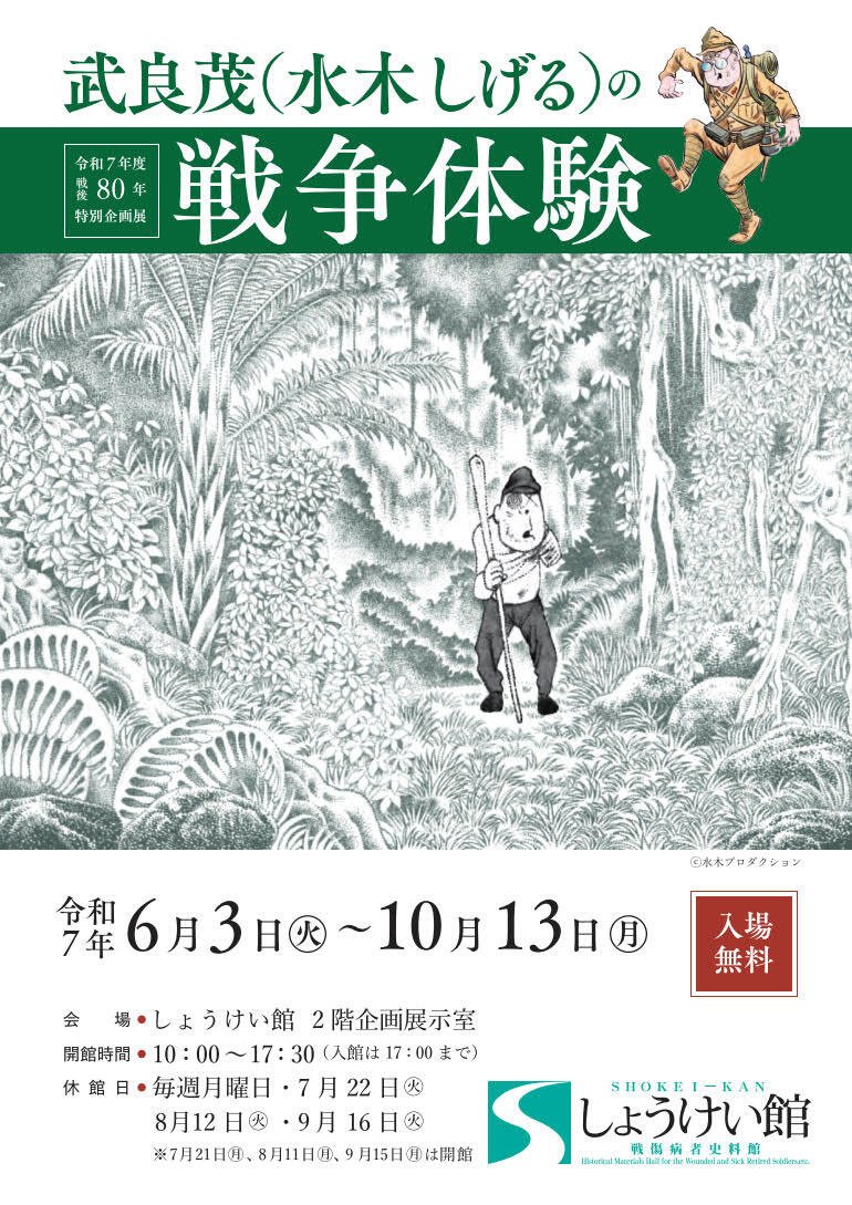本展では、戦争で左腕を失いながらも、その後に漫画家として『ゲゲゲの鬼太郎』や『悪魔くん』など数々の人気作品を世に送り出した水木しげる(本名:武良茂)氏の貴重な戦争体験に焦点を当てています。水木氏は太平洋戦争中、パプアニューギニアの戦地に出征し、過酷な軍隊生活やマラリアの罹患、そして爆撃による重傷を経験しました。また、現地の人びととの心温まる交流も、自身の戦争観に大きな影響を与えたといわれています。そうした体験をもとに描かれた代表作『総員玉砕せよ!』や『昭和史』などの作品資料をはじめ、氏の言葉やスケッチなどを通して、「戦地を生きた一人の人間」としての水木氏の姿を浮かび上がらせています。