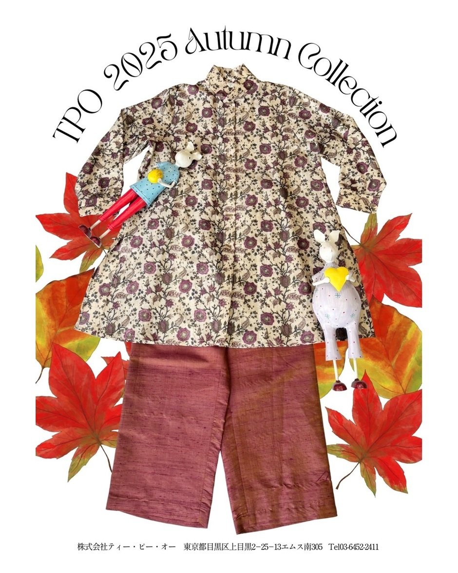 T・P・O(株式会社ティー・ピー・オー)は1986年設立のファッションブランド。西荻窪と阿佐ヶ谷に直営店を構え、フランスやイタリア、インドなど国内外から仕入れた素材をもとに、流行にとらわれない「着心地」と「趣き」ある服を提案し続けています。今回の展示会も、その理念を色濃く体現するコレクションです。