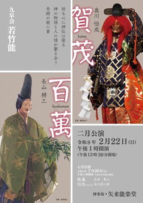室明神の神職(ワキ)が下鴨神社を訪れると、そこで二人の里女(シテ・ツレ)と出 会う。女は賀 茂の神の由来を語ると、自らがその化身であることをほのめかして姿を消す。やがて天上から御祖神(後ツレ)が現れ美しい舞を舞うと、続いて別雷神(後シテ)が降臨し、五穀豊穣を祝い虚空へと上がっていく。