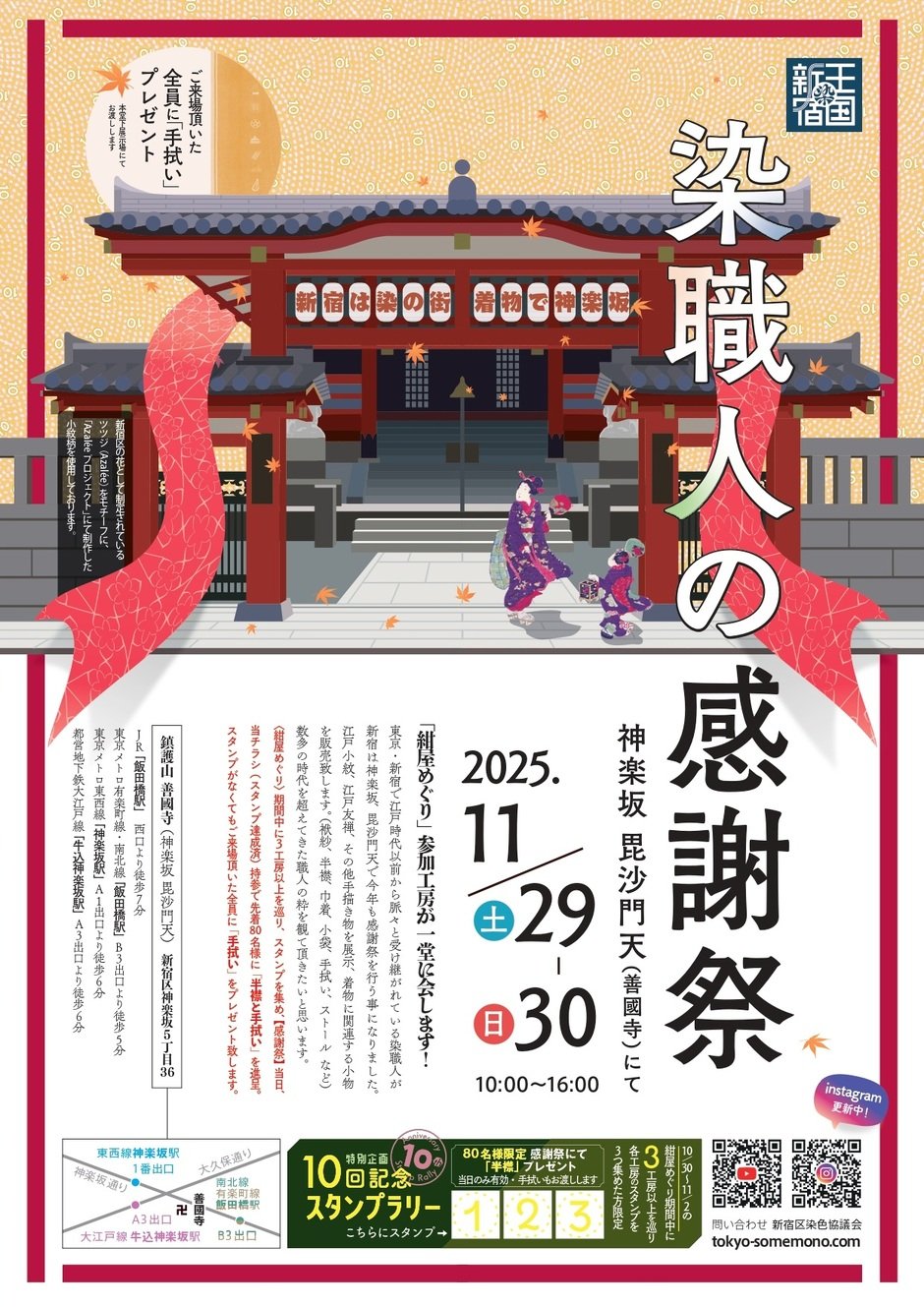 2025年で10周年を迎えた「紺屋めぐり」。今年の「紺屋めぐり」は終了しましたが、期間中に3工房以上を巡ってスタンプを集めた方は、11月29日(土)・30日(日)開催の「染職人の感謝祭」 にスタンプ達成済みのチラシをご持参ください。先着80名様に「半衿と手拭い」を進呈いたします。