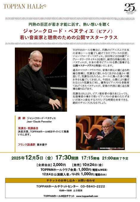 円熟のピアニズムで日本の音楽シーンを魅了し続けてきたフランスの巨匠、ジャン=クロード・ペヌティエが、日本の若手ピアニストを熱く指導する公開マスタークラスを開催します!