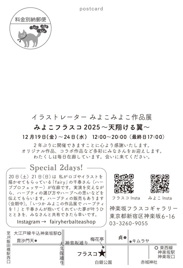 かぐらむらに掲載していた四コマ漫画『神楽坂の親ビン』でもお馴染みの、イラストレーターみよこみよこの2年ぶりの個展です。