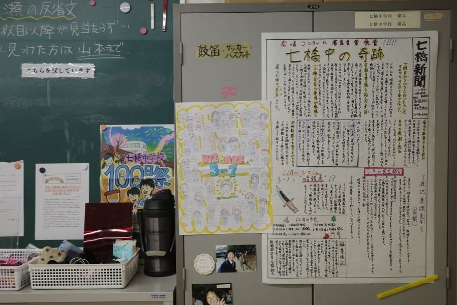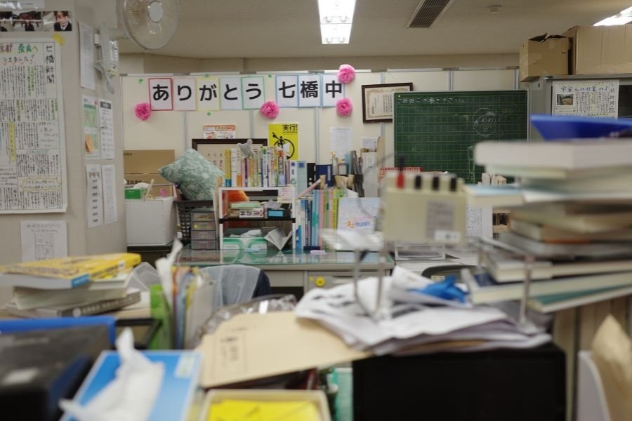 室内には、教員の机や資料だけでなく、生徒が提出したプリント、学校行事の装飾、備品や雑務が残された棚など、閉校直前の状態を再現した。掲示物の貼り方や書類の山、生活の痕跡が残る机の引き出し。そこには「学校」という組織の動脈のように、教育の現場で日々積み重ねられた時間が凝縮されている。