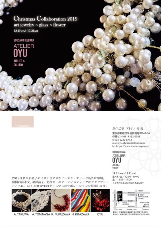 ATELIER OYUのプチギャラリーにて、アーティスティックなジュエリー(富永文、多久和晶子)、ガラス(北澤裕一)、リボン(福澤清子)の作品と、桜優のフラワーアートとのコラボレーションを展開いたします。「大人綺麗!」の作品の数々。ここだけにしかないスペシャルなクリスマスギフトを見つけてください!