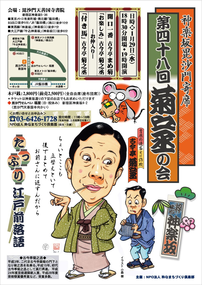 | 地点 | 神楽坂 毘沙門天 善国寺書院 (神楽坂5-36) JR飯田橋駅、西口 徒歩10分 有楽町線飯田橋駅 B3出口 徒歩5分 東西線神楽坂駅(神楽坂口) 徒歩7分 大江戸線牛込神楽坂駅 A3出口 徒歩6分 |