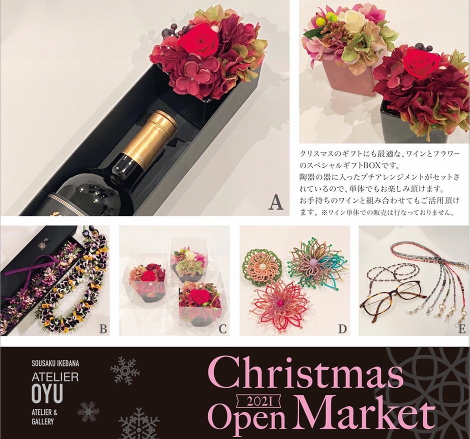 アトリエ桜優5周年の感謝を込めて、クリスマスの2日間ギャラリー前のオープンスペースにてマーケットを開催いたします。オリジナルフラワーギフトをはじめ、関連作家の方々の作品も「特別価格」にて提供いたします。