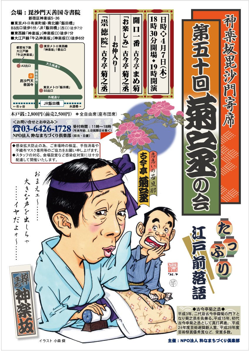 | 地点 | 神楽坂 毘沙門天 善国寺書院 (神楽坂5-36) JR飯田橋駅、西口 徒歩10分 有楽町線飯田橋駅 B3出口 徒歩5分 東西線神楽坂駅(神楽坂口) 徒歩7分 大江戸線牛込神楽坂駅 A3出口 徒歩6分 |
