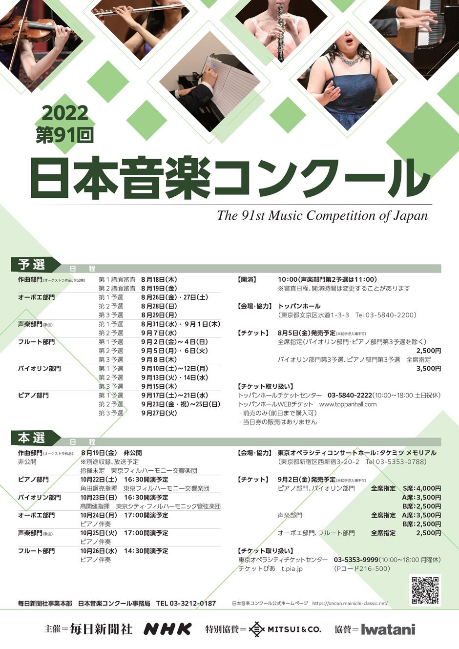 | 联系我们 | [チケットのお申し込み] トッパンホールチケットセンター 03-5840-2222(平日10:00~18:00) [日本音楽コンクールに関するお問い合わせ] 毎日新聞社事業本部内 日本音楽コンクール事務局 03-3212-0187(平日10:00~18:00) |