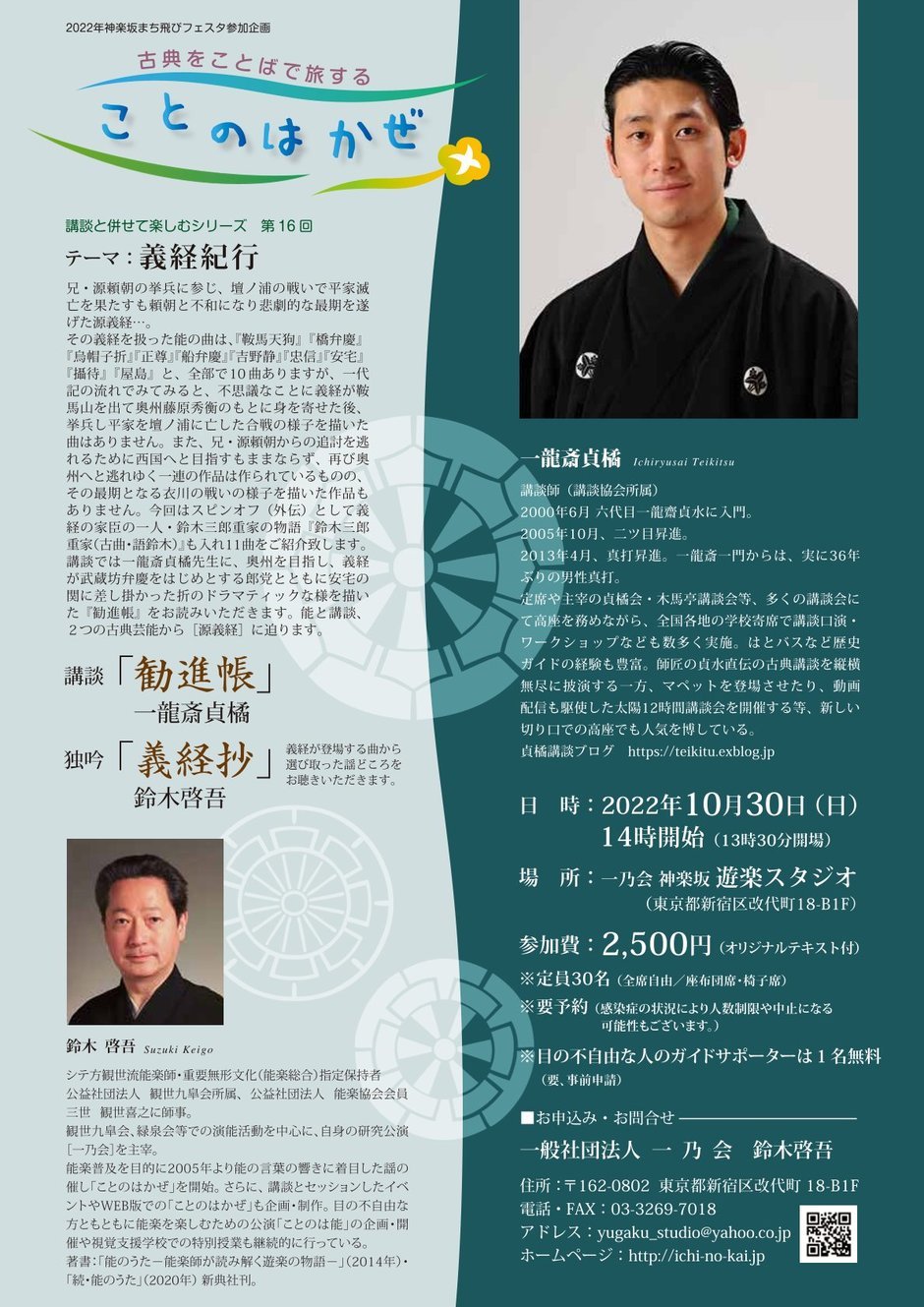 今回は「義経紀行」をテーマに、観世流能楽師・鈴木啓吾による義経を扱った謡曲11曲より謡どころを、また、講談師・一龍斎貞橘による講談「勧進帳」をお聴きいただきます。