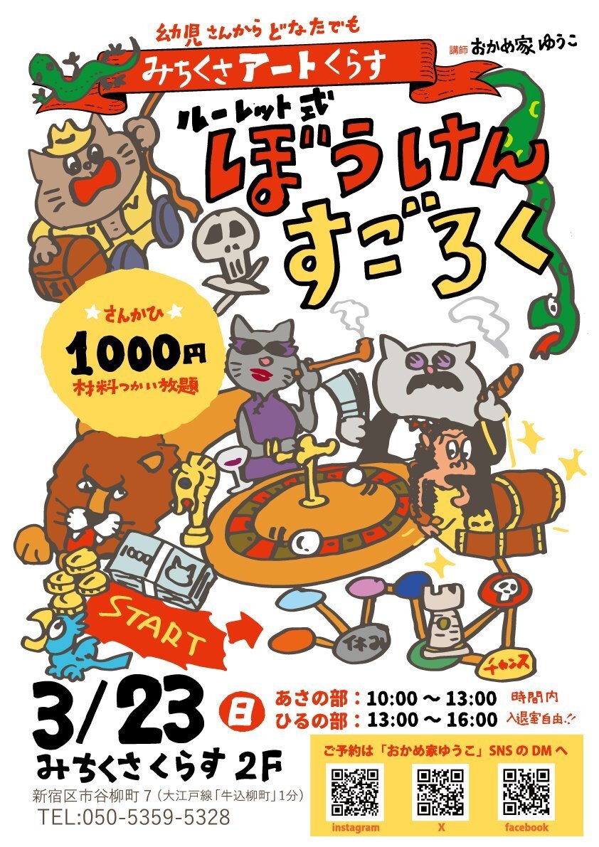 | 时间 | あさの部:10:00~13:00 ひるの部:13:00~16:00 時間内、入退室自由 |