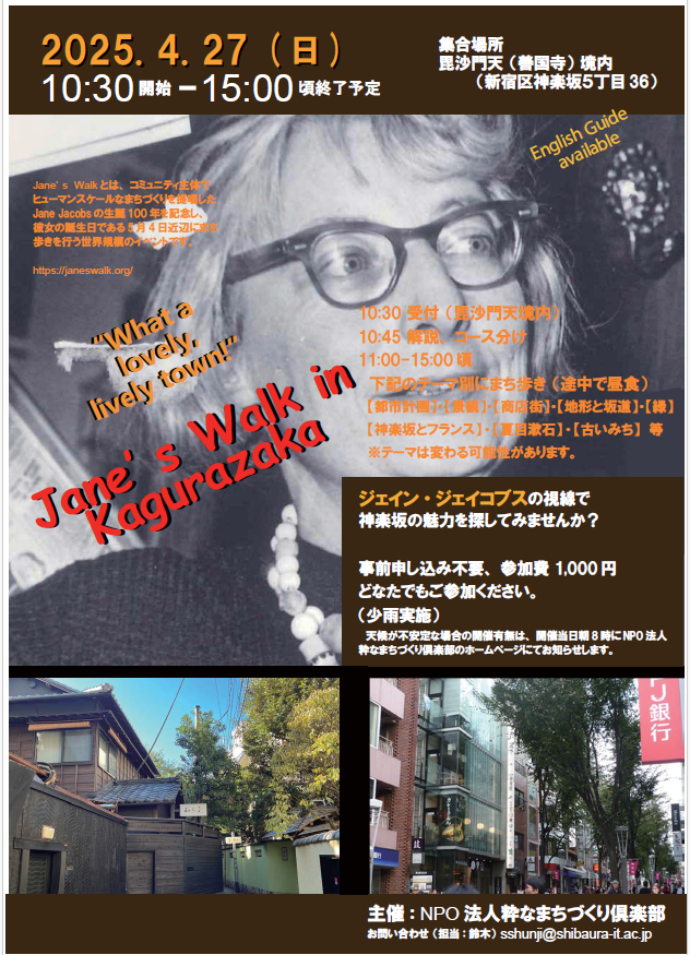 Janeの誕生日が5月4日であるため、このイベントは、世界の諸都市でその周辺の日程で実施することになっています。今年2025年はNPO粋なまちづくり倶楽部主催で、4月27日(日)に実施いたします。神楽坂のまちをさまざまな視点から改めて見直しながら歩きます。多くの皆様のご参加をお待ちしております。English guide will be available.
