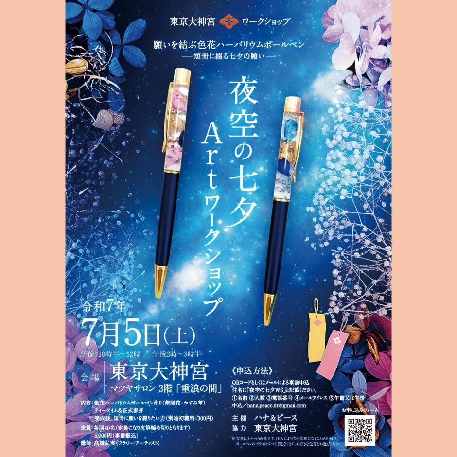 ワークショップでは、紫陽花やかすみ草など12種類の花材の中から、お好きな色や花を選んで、自分だけのオリジナルボールペンを作ることができます。完成後、ご希望の方は短冊(別途初穂料300円)に願いを綴ることも。