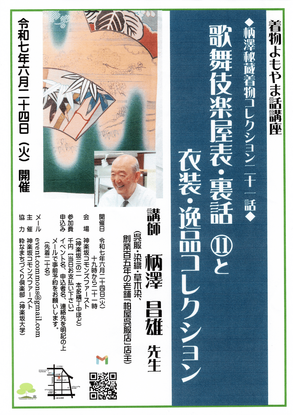 神楽坂コモンズファースト主催・粋なまちづくり倶楽部協力の、着物・染め物よもやま話「柄澤昌雄コレクション第21話」のお誘いです。