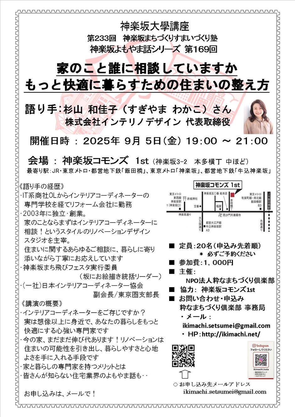 | 地点 | 神楽坂コモンズ 1st (神楽坂3-2 本多横丁 中ほど) 最寄り駅:JR・東京メトロ・都営地下鉄「飯田橋」、東京メトロ「神楽坂」、都営地下鉄「牛込神楽坂」 |