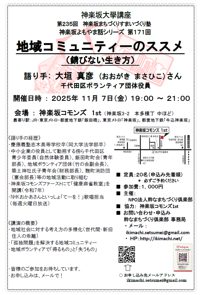 | 地点 | 神楽坂コモンズ 1st (神楽坂3-2 本多横丁 中ほど) 最寄り駅:JR・東京メトロ・都営地下鉄「飯田橋」、東京メトロ「神楽坂」、都営地下鉄「牛込神楽坂」 |