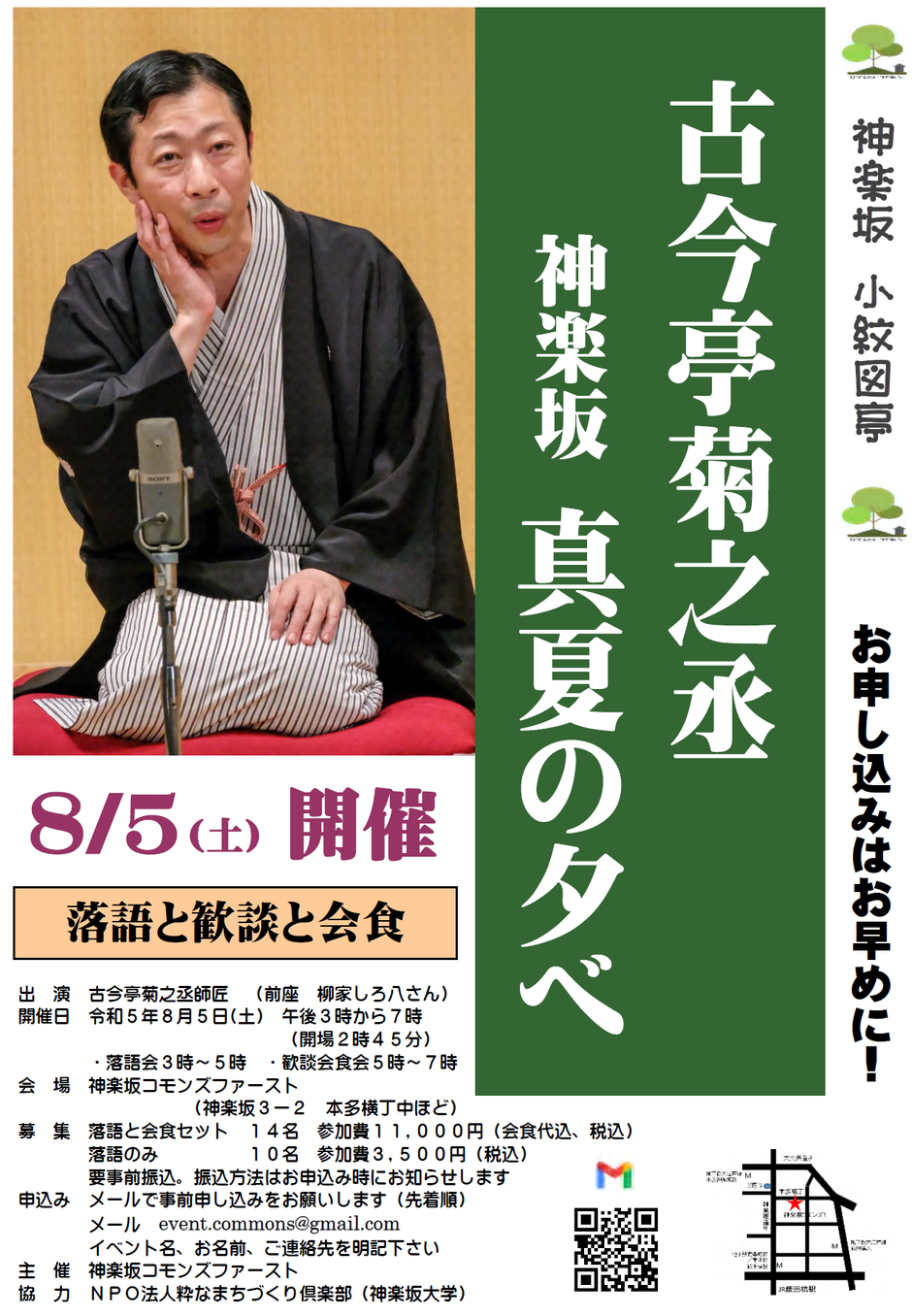 | 招聘人数 | 落語と会食 14名 参加費11,000円(会食代込、税込) 落語のみ 10名 参加費 3,500円(税込) |