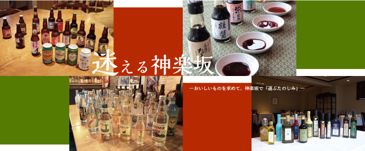 神楽坂ブームで、まちの名前が全国区になってから、神楽坂土産やオリジナル商品を求める傾向が強まっています。一方、観光地的な要素も多く、全国で人気の名産品の集積地のような一面もうかがえます。神楽坂で、いま、どんな商品が話題にのぼっているのか? 普段から身近に味わっている地ビール、地サイダー、醤油、オリーブオイルの4つに焦点を絞って、編集部で体験的考察を試みました。コンセプトは、「迷える神楽坂」。大いに迷って、神楽坂でいいものと出会ってみませんか?