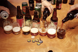 北(北海道、青森、秋田、岩手)の名産品を集め、生産者と消費者を繋ぐ北のプレミアムフード館(以下、北プレ館)が今年4月に神楽坂にオープン。約26種類の地ビール、発泡酒が勢ぞろいしました。そこで猛暑が予想される夏を前に、北プレ館での地ビールの試飲会&取材の会を企画しました。1番目の迷いは、地ビールです。