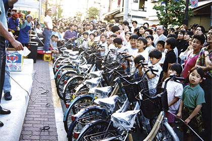 神楽坂6丁目商店街を代表するイベント。開催日は、春と秋の2回。今年の秋で66回目となるから、少なくとも33年目は続いている。一番はじめの名称は「さくらまつり」(この名称だと、年1回だったか)、次に「青空市」、そして現在の「青空フェスタ」になって定着した。その魅力は何といっても各商店の人気ブースと、大判振舞いのプレゼントコーナー。お米や野菜、くだものがふんだんに当たる。ところが昔の市では、自転車が一番のプレゼント商品だった(写真参照)。イベントを支えるのは、地元参加の商店店主たち。日頃の感謝をこめて、汗水流してイベントを盛り上げた。そのアットホームな雰囲気が、現在まで続く人気の源である。