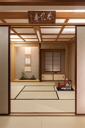 天神町のビルの6階、扉を開けると思いもよらない異空間が広がる。美しく静謐な茶室である。小笠原流煎茶道の茶室で「春風庵」という。庵主は鈴木翠江さん。その室礼をお聞きして納得した。NHKの美術担当と空間デザイナーがつくったからだ。ビルの6階なのに時空を超えて心が落ち着くのは、そのせいかもしれない。通うのは、神楽坂に仕事場のある女性が多く、「ここで心のチューニングをしている」とか。お稽古の時間帯は、仕事帰りに都合のよい夜に設けられている。お稽古で、一日の疲れがとれるという人も少なくない。