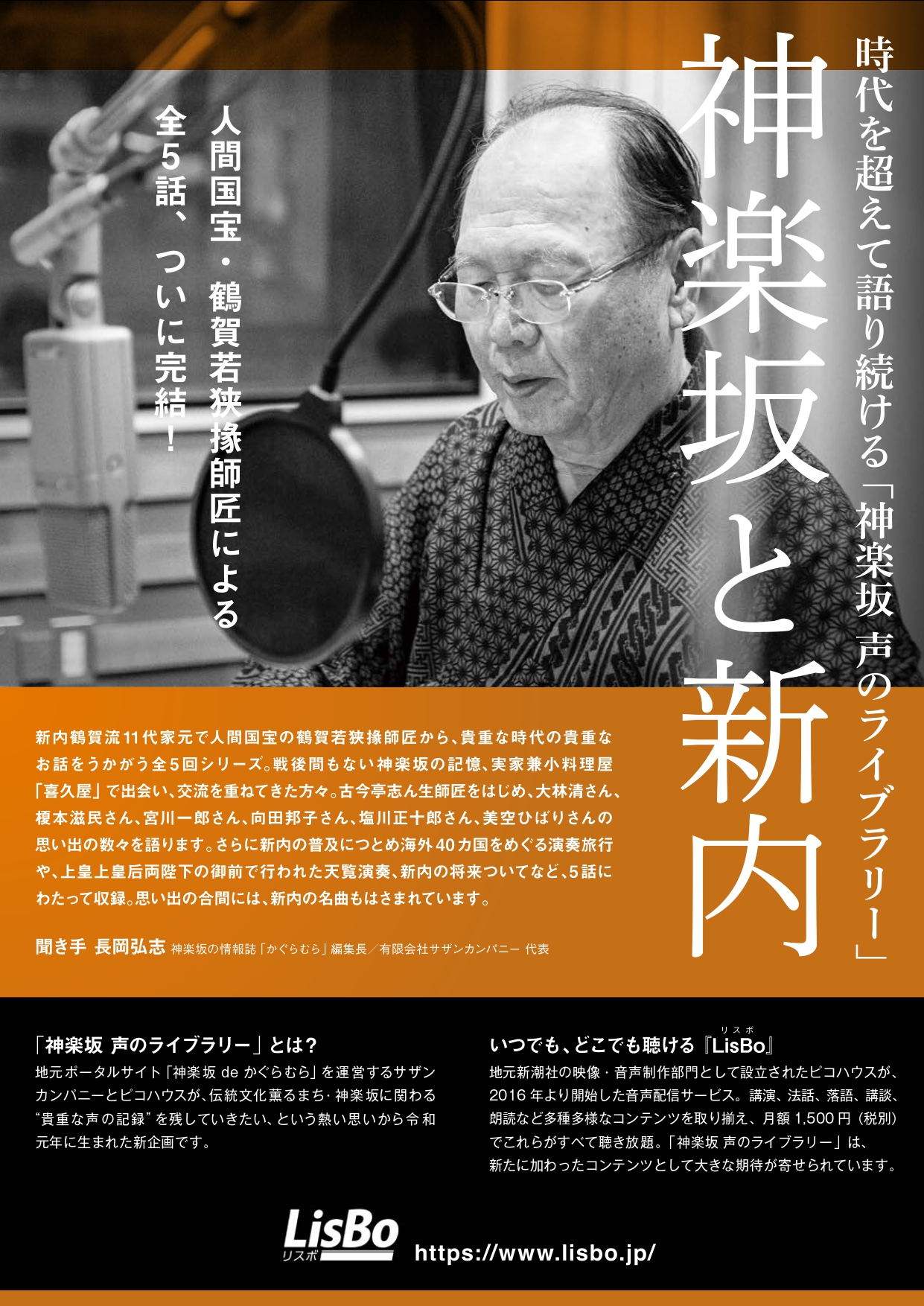 神楽坂・声のライブラリー 第3弾 「生まれも育ちも神楽坂」ついに完結‼ 「生まれも育ちも神楽坂」2回シリーズ 第1回「戦後の神楽坂花柳界」 第2回「まちと花柳界の関り」 出演:斉藤れい子(由みゑ姐さん) 聞き手:長岡弘志 LisBoホームページ:https://www.lisbo.jp/ LisBo(リスボ)より4月13日から配信開始! 「神楽坂・声のライブラリー」シリーズの第3弾は、戦後神楽坂の花柳界の記憶を、今も現役で芸に励む芸者さん、由みゑ姐さんにお話をお伺いする会です。2回の構成で、1回目は昭和21年生まれの由みゑ姐さんの少女時代からお披露目までの思い出。 第2回目は、神楽坂のまちと花柳界のつながり。話の間に飛びだすお座敷遊び用の芸、痛快でお見事なその芸の数々はお座敷が和むものばかり。お話の聞き手は、地元神楽坂の情報誌「かぐらむら」の長岡弘志編集長です。以下は、インタビュー後の長岡編集長の感想です。 |